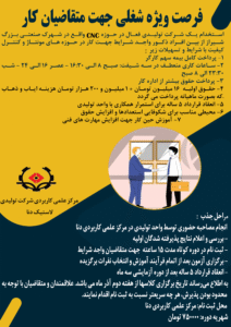 استخدام یک شرکت تولیدی فعال در حوزه CNC واقع در شهرک صنعتی بزرگ شیراز از بین افراد ذکور واجد شرایط جهت کار در حوزه های مونتاژ و کنترل کیفیت با شرایط و تسهیلات زیر: